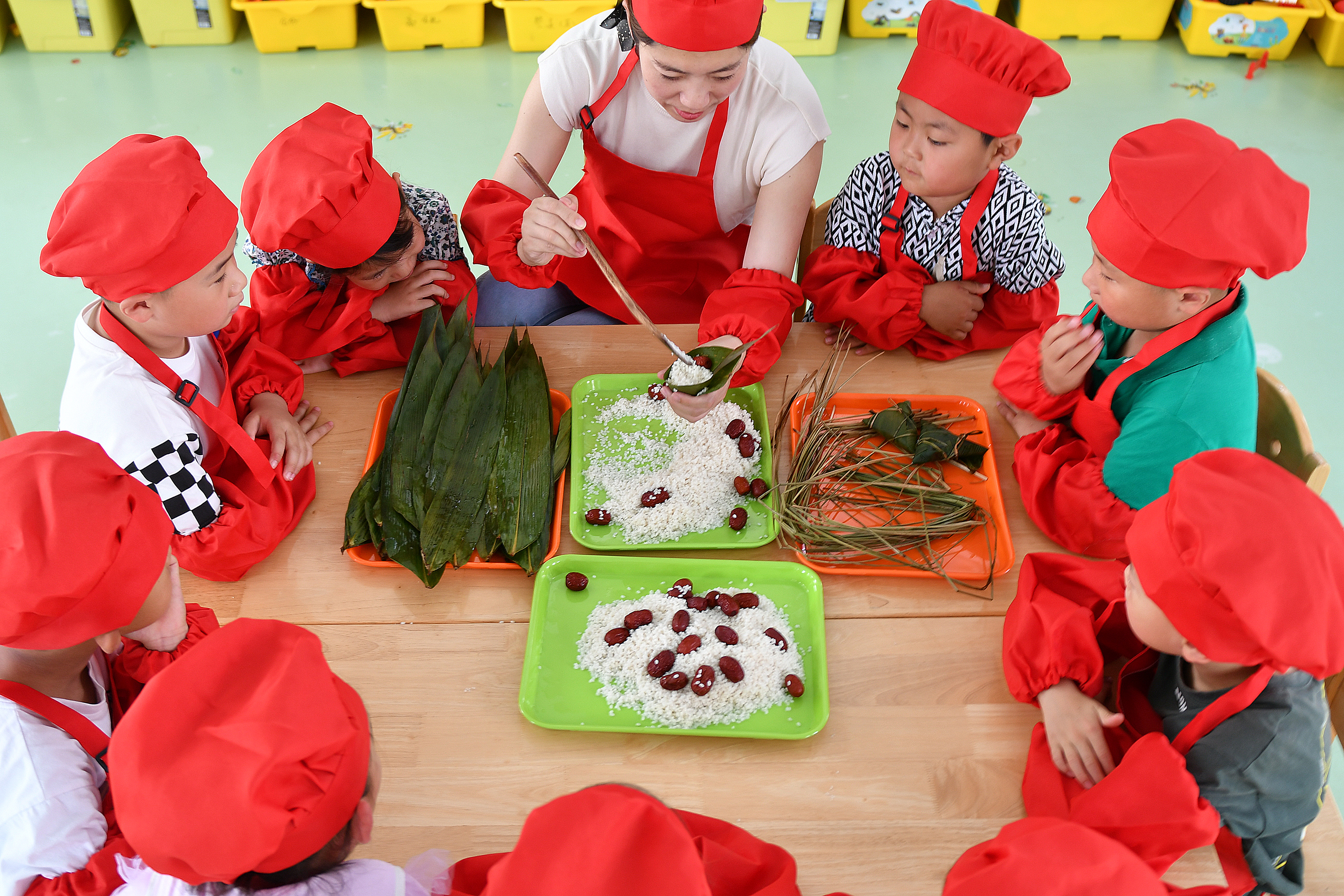 6月19日,山东省烟台市福山区清洋街道中心幼儿园的小朋友在老师指导下学习包粽子。