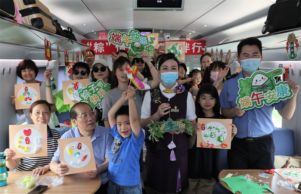 端午节前夕,铁路上海客运段在列车上邀请旅客参加端午民俗活动,迎接端午佳节。 新华社记者 王 翔 摄