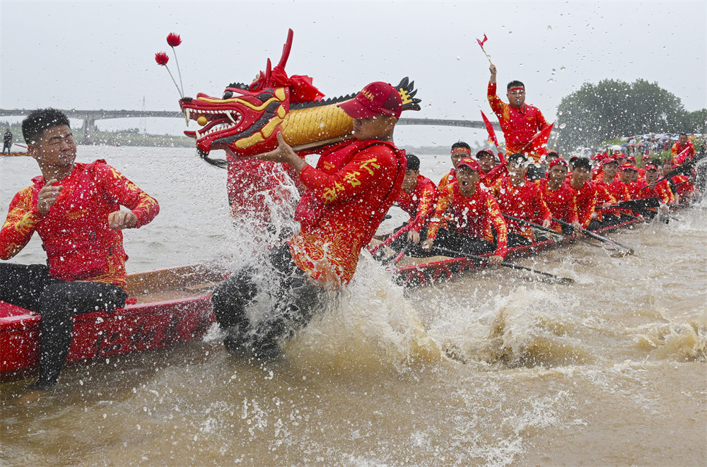 6月22日,在湖南省岳阳市湘阴县湘江临资口水域,参加龙舟赛的队员接“龙头”下水,在运动快乐中体验传统民俗。