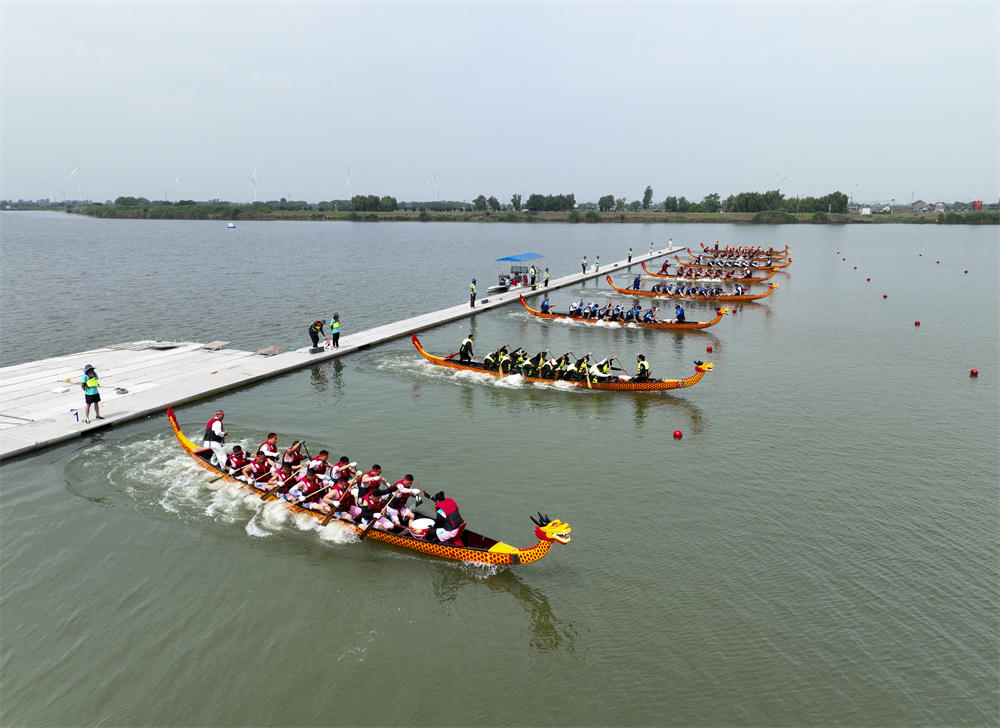 6月23日,兴化市第十五届龙舟大赛中,参赛选手从起点出发(无人机照片)。