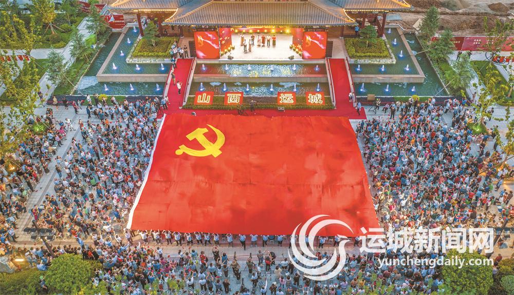 运城晚报讯(记者 茹雅)“你看那天边有颗闪亮的星星,关山飞越一路撒下光明。咱们就跟着他的脚步走啊,哪管他道路平不平!”深情的旋律震撼人心,约300平方米的巨幅党旗在人们手中庄严地传递着……