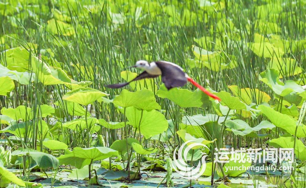 6月25日,闻喜县东镇镇仓底村荷塘里,一只黑翅长脚鹬在水面觅食。黑翅长脚鹬有着“水鸟模特”的美称。近年来,随着我市生态环境质量的不断提升,黑翅长脚鹬等珍稀鸟类频频光顾盐湖、黄河浅滩以及小鱼塘。 特约摄影 姚中吉 摄