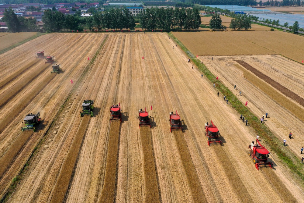 近日,2023年山东小麦机收减损技能大比武活动在临沭县举行,农机手驾驶收割机进行机收减损比武竞赛。(无人机照片)。