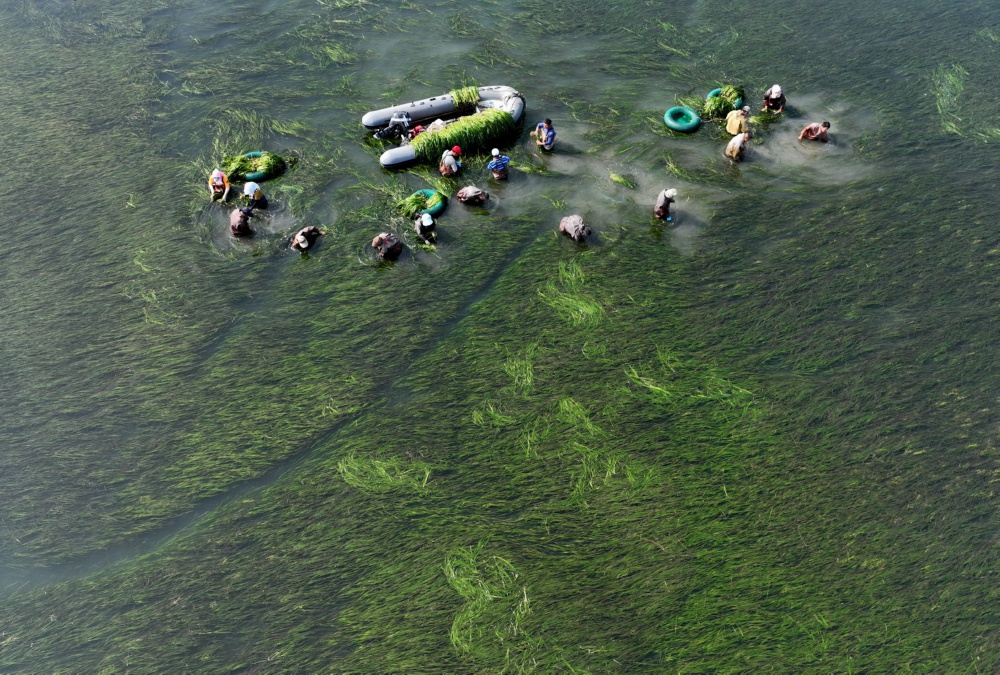 6月25日,中船环境集团的工人在唐山市曹妃甸区海洋生态保护与修复项目鳗草苗采集海域采集鳗草苗。由中船环境集团承建、2022年启动的河北省唐山市曹妃甸区海洋生态保护与修复项目目前正在按照“自然修复为主,人工干预为辅”的原则,进行鳗草种苗移栽等工作。此项目计划总修复面积为636公顷,目前海草床修复面积已经达到预定计划的80%。海草生态系统可以改善近岸非生物环境,提高近岸抵御潮汐和波浪的能力。