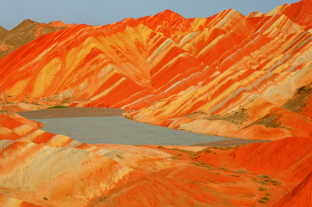 这是6月25日拍摄的甘肃省张掖市七彩丹霞景区。正值盛夏时节,七彩丹霞景区在蓝天白云的映衬下气势磅礴,色彩艳丽。