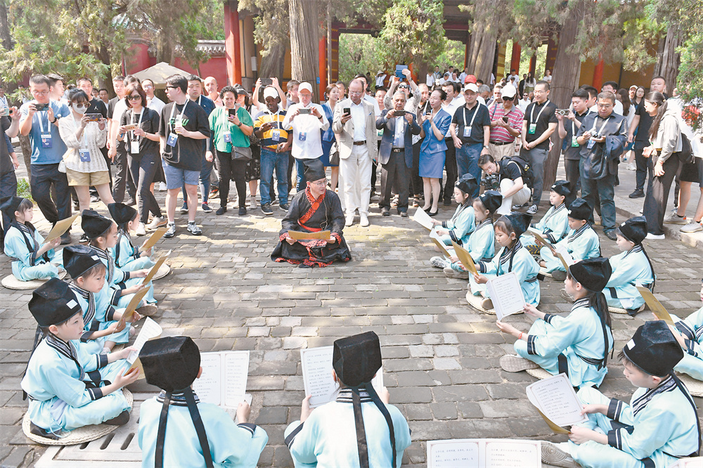 ▲6月27日,在曲阜孔庙,嘉宾和游客在聆听孩子们诵读《论语》。