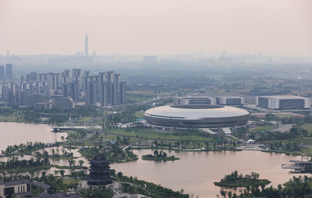 图为俯瞰东安湖体育公园一角(6月27日摄)。东安湖体育公园是第31届世界大学生夏季运动会核心场馆、开幕式主体育场所在地。成都大运会将于7月28日至8月8日举行。 新华社记者 江宏景 摄
