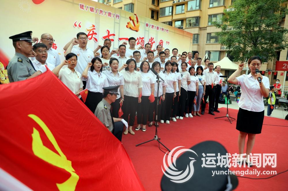 图①:6月29日,盐湖区安邑街道金海湾社区党支部联合金海湾小区物业党支部,在该小区开展“庆七一颂党恩”文艺晚会。图为社区党员代表重温入党誓词。 本报记者 冯革才 摄