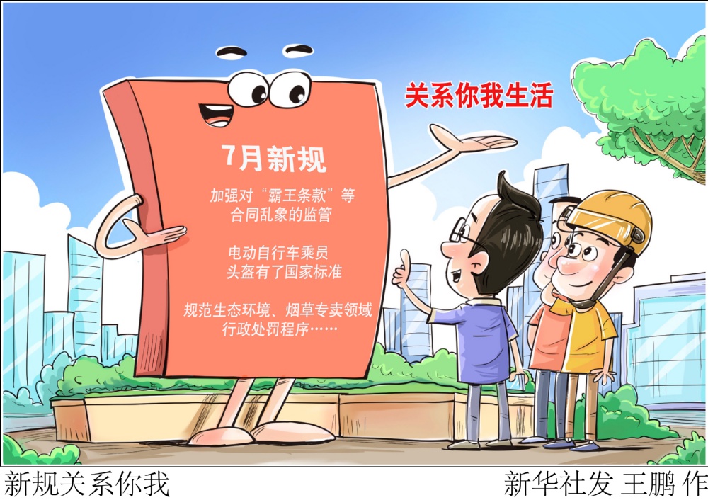 7月如约而至,又一批新规开始施行。加强对“霸王条款”等合同乱象的监管,电动自行车乘员头盔有了国家标准,规范生态环境、烟草专卖领域行政处罚程序……点滴法治进步,关系你我生活。