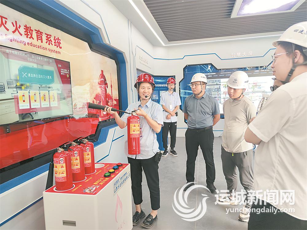 工作人员向与会人员介绍工地消防器材配备及使用规范 见习记者 赵雪 摄