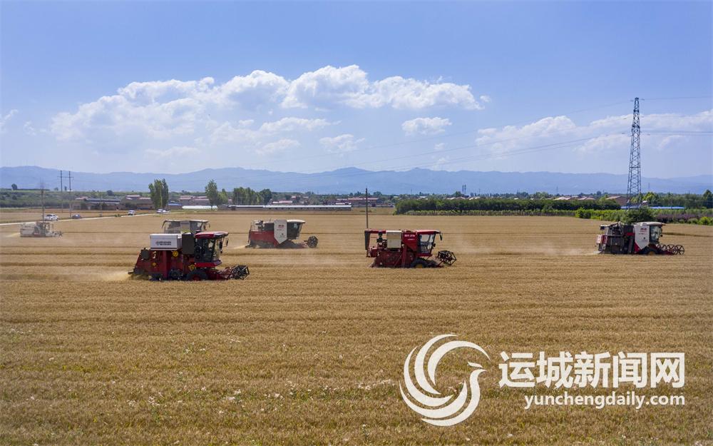 夏县王学家庭农场内,多台收割机在规模作业(资料图片)。