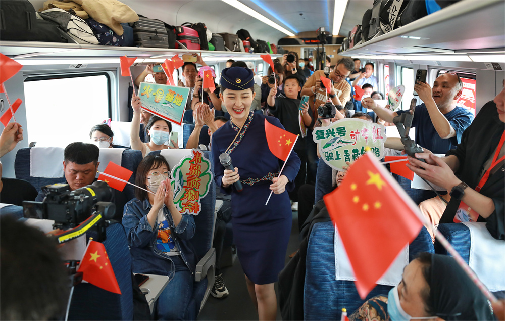 7月1日,在C891次西宁至格尔木动车组列车上,乘务员与乘客互动。