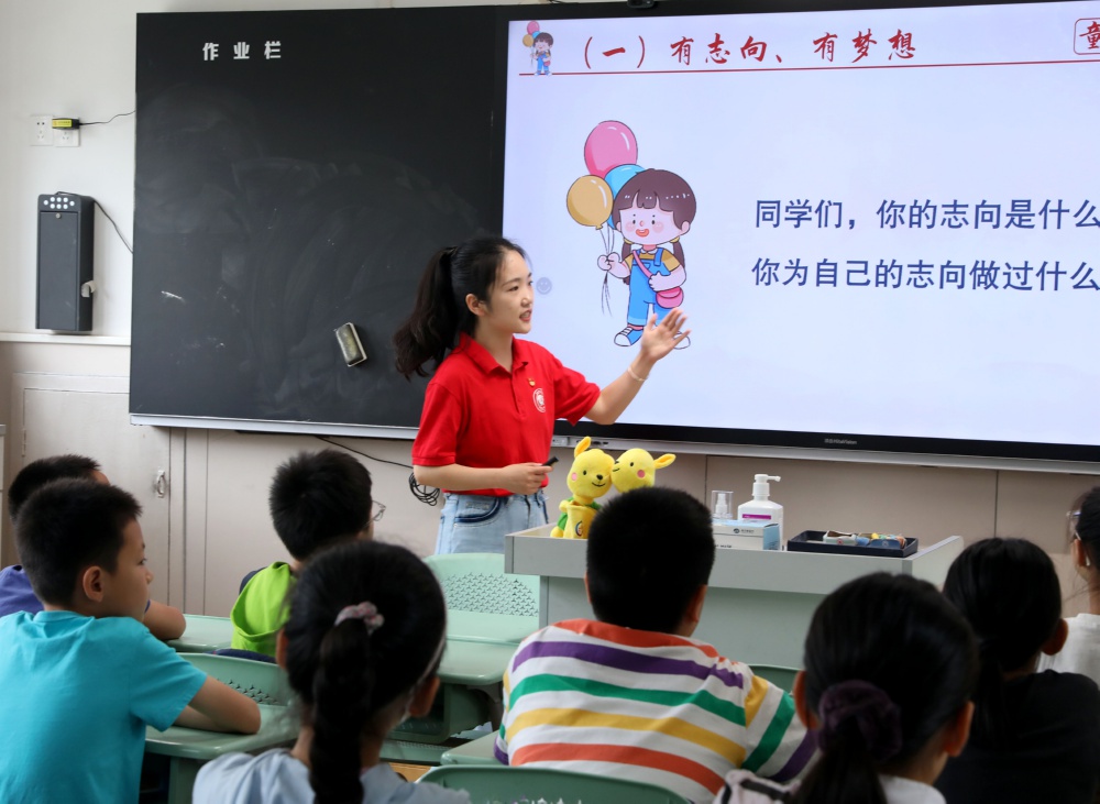 7月3日,在徐汇区虹梅街道办班点的漕河泾新兴技术开发区实验小学,志愿者带领孩子们上“开班第一课”。