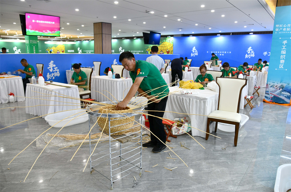 7月3日,在第一届全国农民技能大赛上,选手参加手工编织项目比赛。