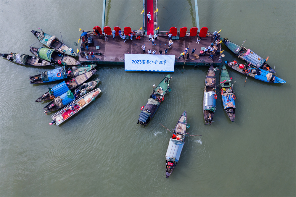 7月3日,富春江开渔节在浙江省杭州市富阳区场口镇东梓关村的码头举行,当地渔民满载着鱼获,返回东梓关码头,喜迎开渔后首场丰收。
