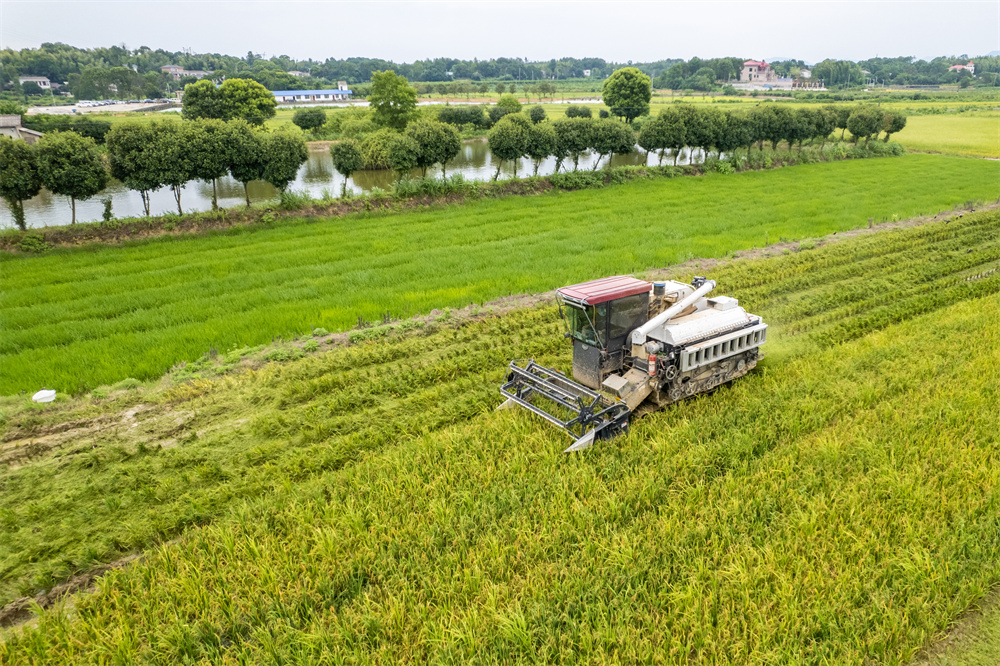 7月4日,在长沙市望城区茶亭镇苏蓼村,收割机在收割早稻(无人机照片)。