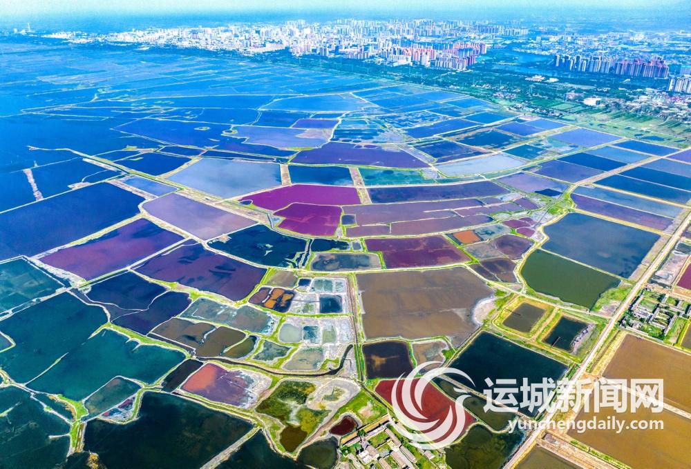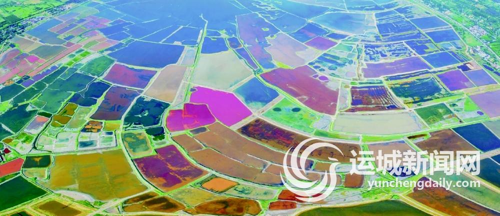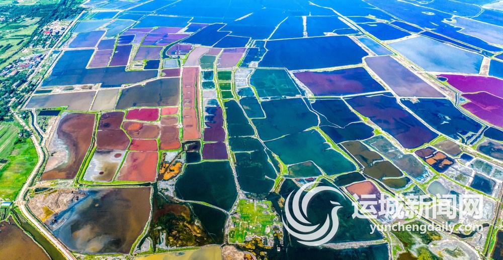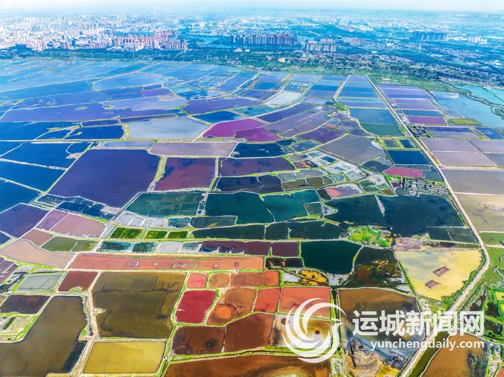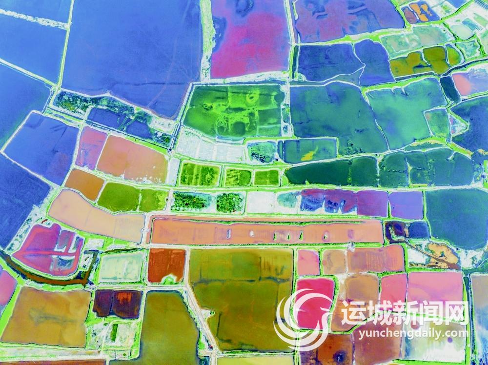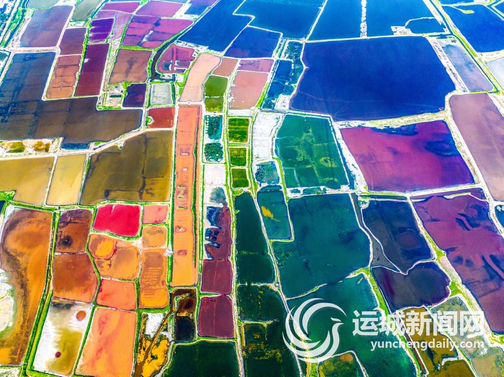 7月的运城,烈日炎炎,来到盐湖岸边,从高处俯瞰,红似绸缎、粉若晚霞、碧如翡翠、黄比蜜蜡……仿佛大自然的调色盘遗落于此,斑斓色彩点缀河东大地。