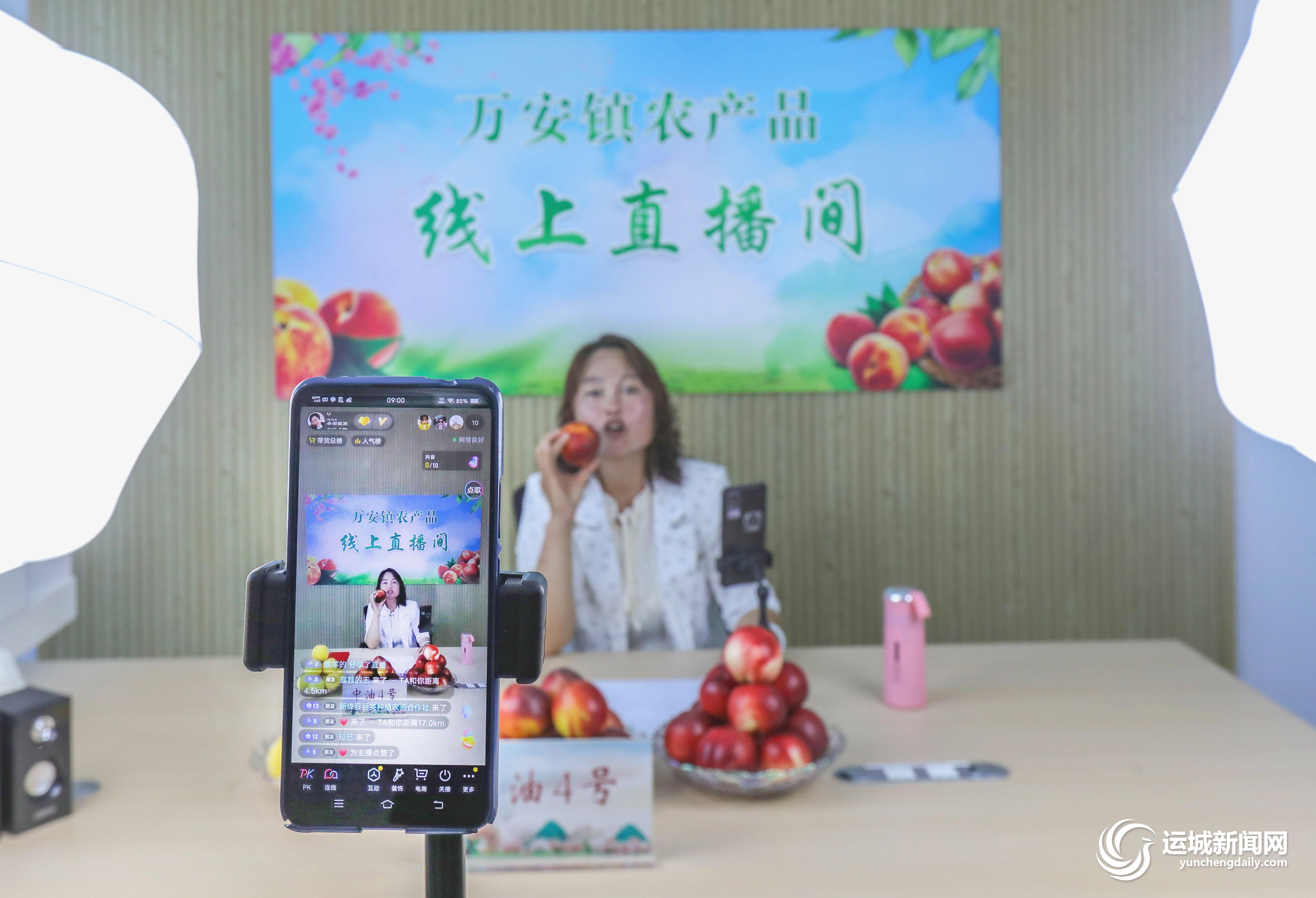 7月3日,新绛县万安镇“新手”农民主播在网上销售油桃。