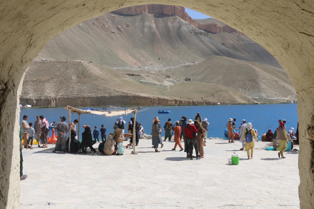 7月3日,游客在阿富汗巴米扬省班达米尔国家公园内的班达米尔湖边游玩。