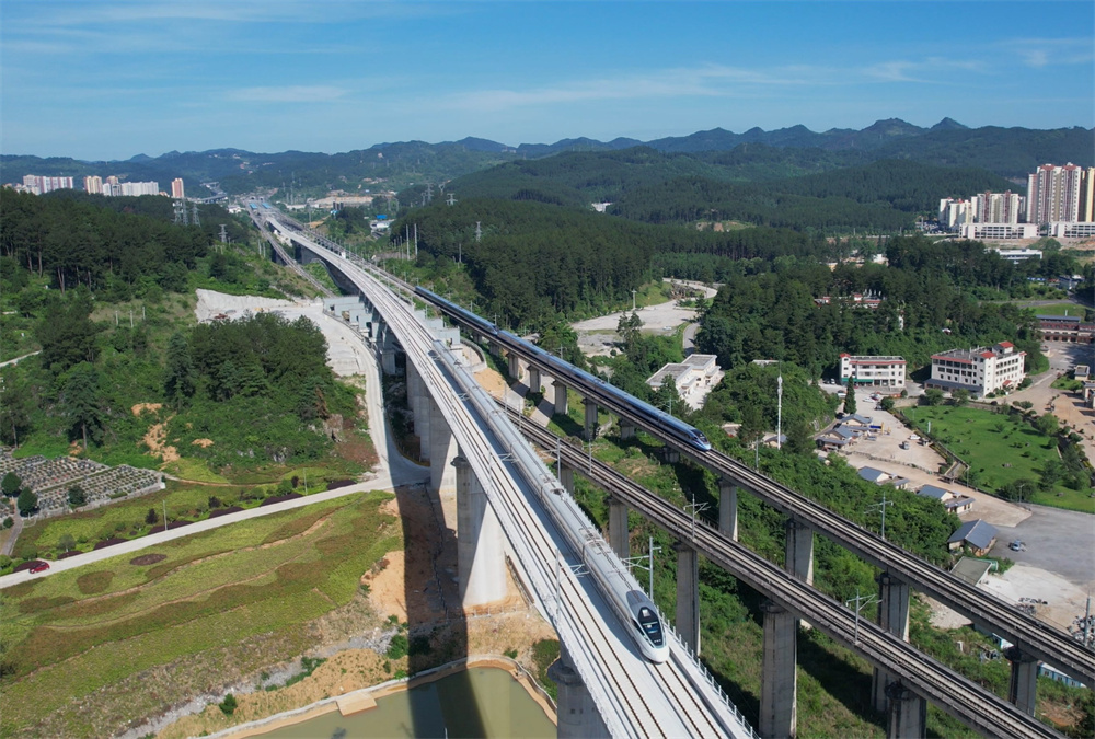7月5日,参与试验的55301次列车(左)从贵阳北站驶出,行驶在贵州省龙里县境内(无人机照片),这标志着贵南高铁贵州段进入按图行车试验阶段。