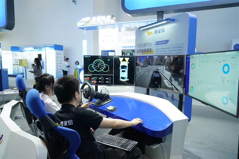 7月4日,在北京国家会议中心2023全球数字经济大会精品主题展现场,工作人员(右)进行汽车仿真平台漏洞攻防演示讲解。