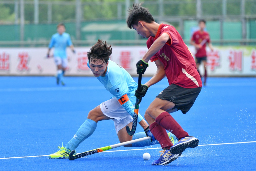 7月6日,深圳队球员张佳良(右)在比赛中与南宁队球员李剀拼抢。当日,在江苏常州武进曲棍球训练基地举办的第一届全国学生(青年)运动会(公开组)曲棍球男子决赛阶段比赛中,深圳队以1比0战胜南宁队。