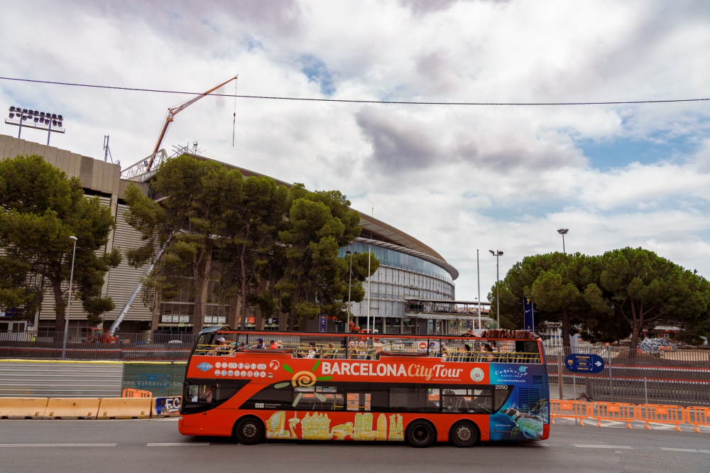 7月5日,一辆观光大巴经过正在施工的诺坎普体育场。近日,西甲巴塞罗那队主场诺坎普体育场重建工作开启。2023-24赛季,巴萨主场将暂时迁至巴塞罗那奥林匹克体育场。