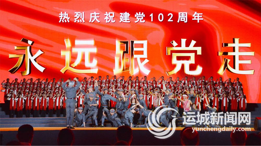 以音乐感悟党史,用歌声铭记初心。《党旗下的誓言》《绿水青山新河津》……7月2日晚,河津市11家市直单位在龙门广场进行大合唱展演,职工们把爱国爱党的热情转化为凝心聚力、感恩奋进、勇毅前行的嘹亮凯歌,唱响了一曲曲忠诚奉献的主旋律,为庆祝中国共产党成立102周年献上诚挚的祝福。