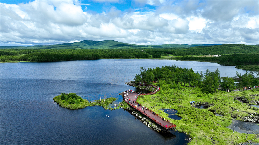 7月6日,游客在内蒙古阿尔山国家森林公园杜鹃湖游玩。今年1月至6月,当地已实现旅游收入16.5亿元。