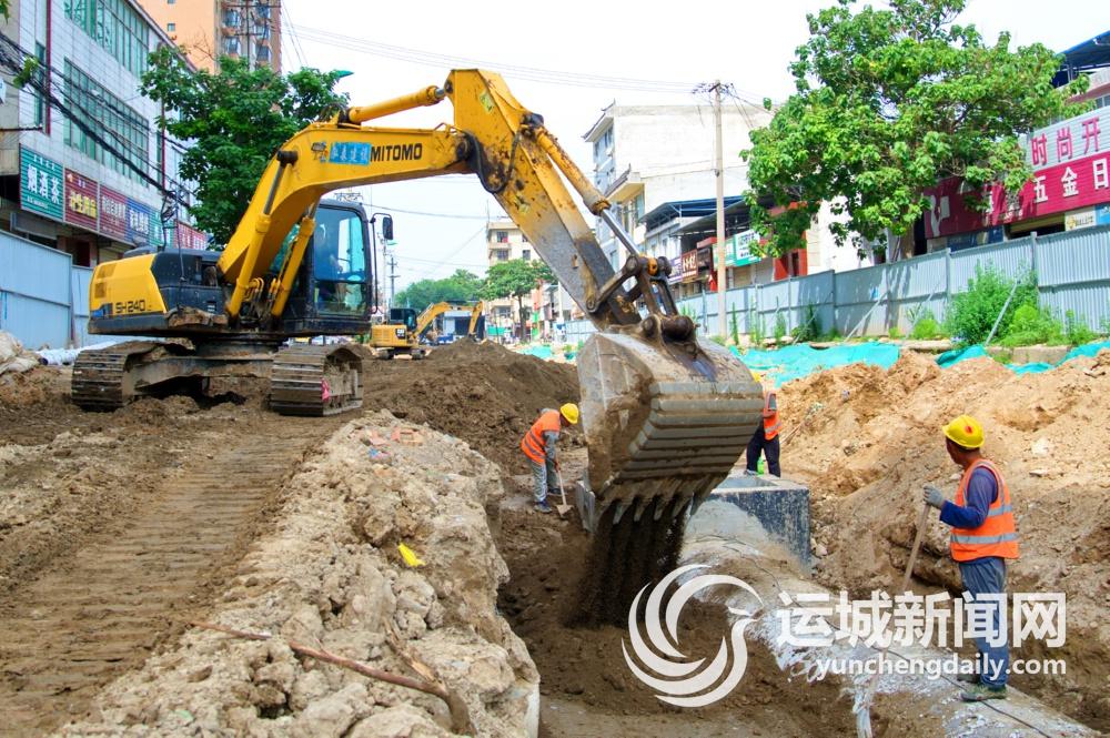 7月7日,盐湖区南城墙街的施工现场,工人们正在铺设管道。