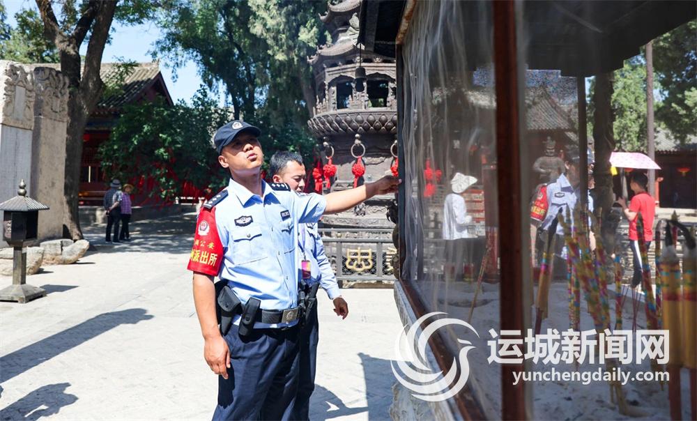 夏日炎炎,防火为先。近日,盐湖公安分局解州派出所民警走进辖区关帝庙等景区,开展了文物保护消防安全检查。