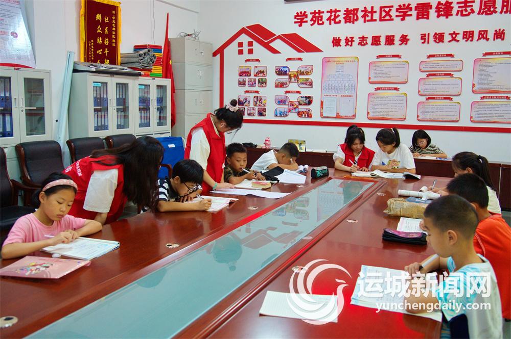 暑假期间,学苑花都社区联合盐湖区青年志愿者协会,组织以大学生为主的志愿者,为辖区内中小学生提供免费暑期作业辅导。