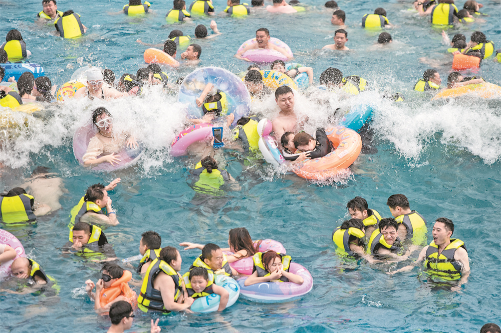 7月8日,游客在安徽省芜湖市南陵县大浦乡村世界的海啸馆戏水游玩。 炎炎夏日,当地群众纷纷走出家门,戏水游玩,乐享清凉。 新华社发(肖本祥 摄)
