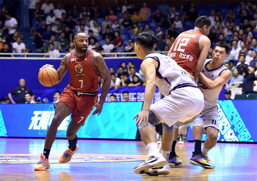 7月9日,石家庄翔蓝队球员香浓·肖特(左一)在比赛中带球进攻。