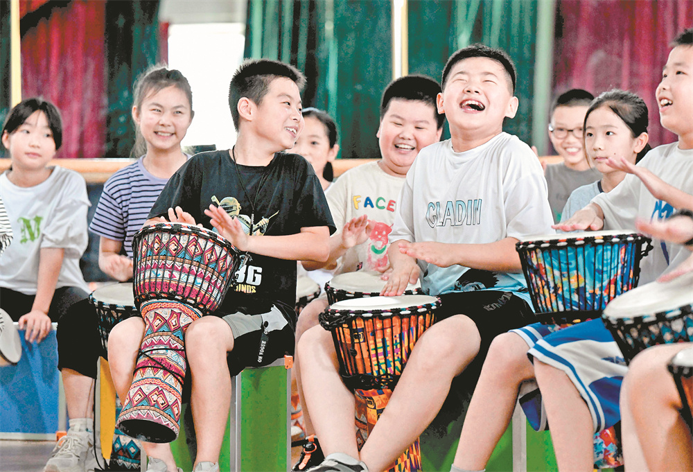 7月10日,学生在河北省石家庄市兴华小学练习非洲鼓。