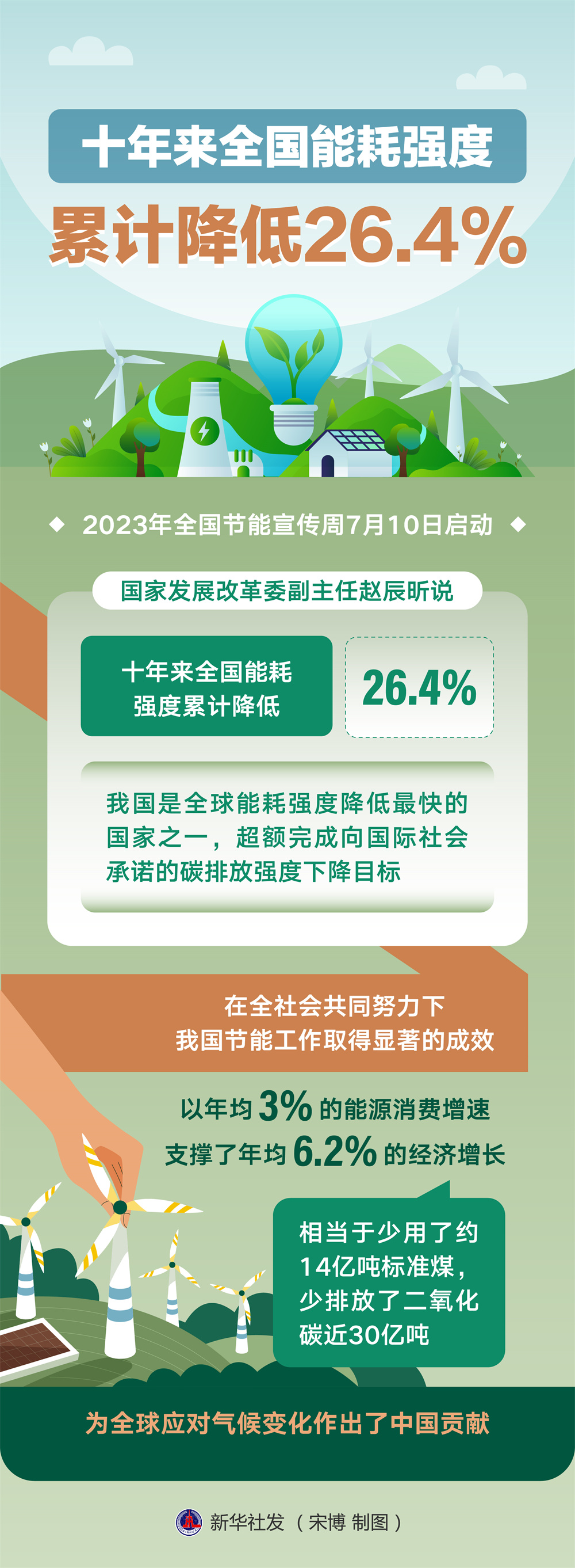 2023年全国节能宣传周7月10日启动。在当日于广州举行的启动仪式上,国家发展改革委副主任赵辰昕说,十年来全国能耗强度累计降低了26.4%,我国是全球能耗强度降低最快的国家之一,超额完成向国际社会承诺的碳排放强度下降目标。