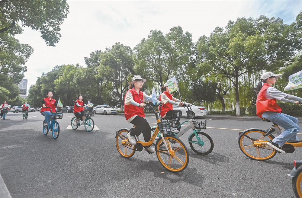 7月11日,青年志愿者们在湖州市田盛街骑自行车并进行低碳日主题宣传,倡导绿色出行。 在“全国低碳日”来临之际,浙江省湖州市吴兴区龙泉街道在多个社区组织开展了形式多样、内容丰富的低碳环保系列宣传活动,并发起争做“绿色生活、绿色出行、绿色消费”低碳践行者的倡议,倡导绿色低碳生活新风尚。 新华社记者 徐 昱 摄