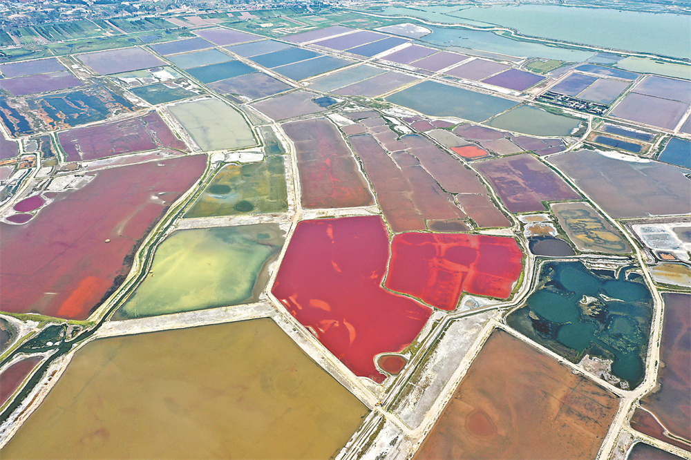 夏日时节,随着气温不断升高,山西运城盐湖呈现出色彩斑斓的景象。从空中俯瞰,犹如天然“调色盘”。