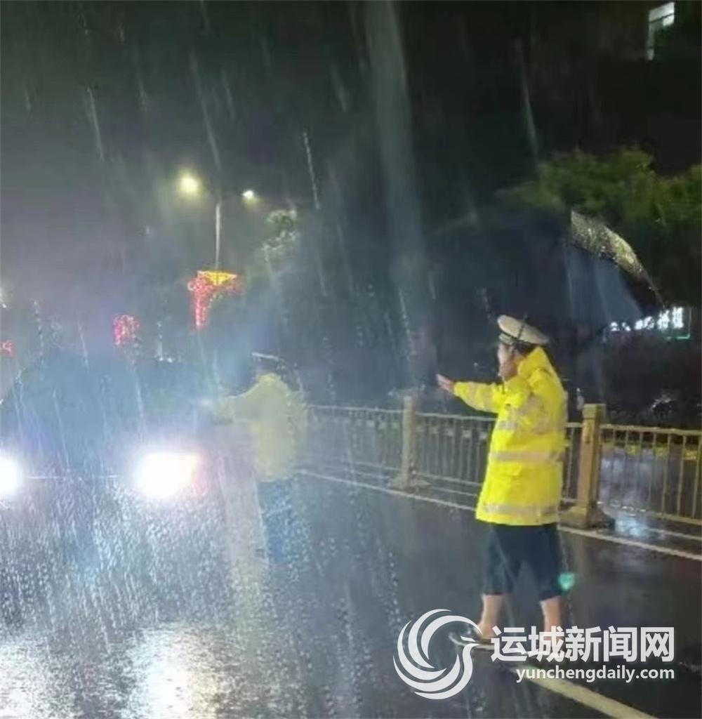 7月13日凌晨2时许,盐湖交警大队公路巡警中队民警在学苑路冒雨指挥交通。