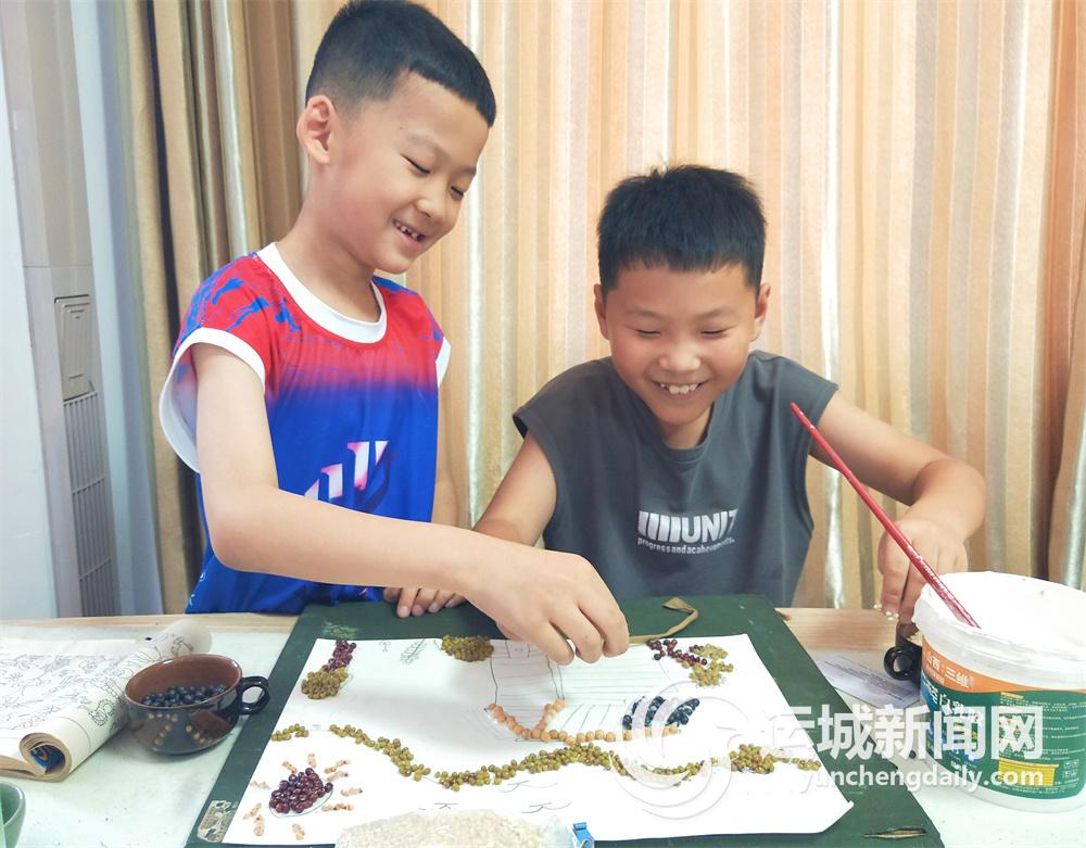 美术课上,孩子用绿豆、黄豆等制作手工创意画。