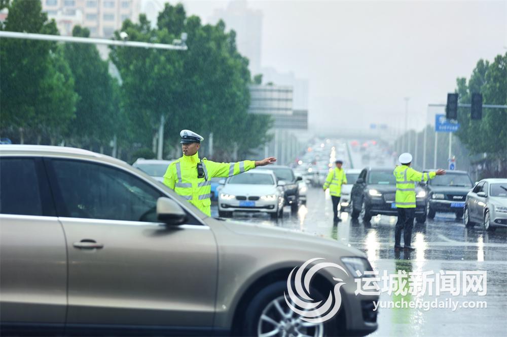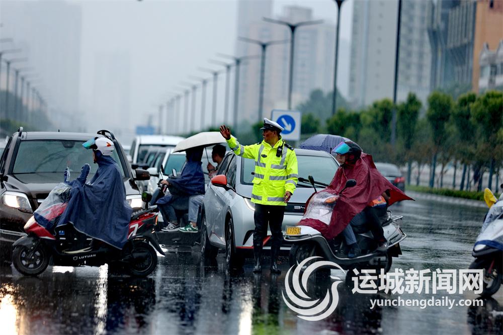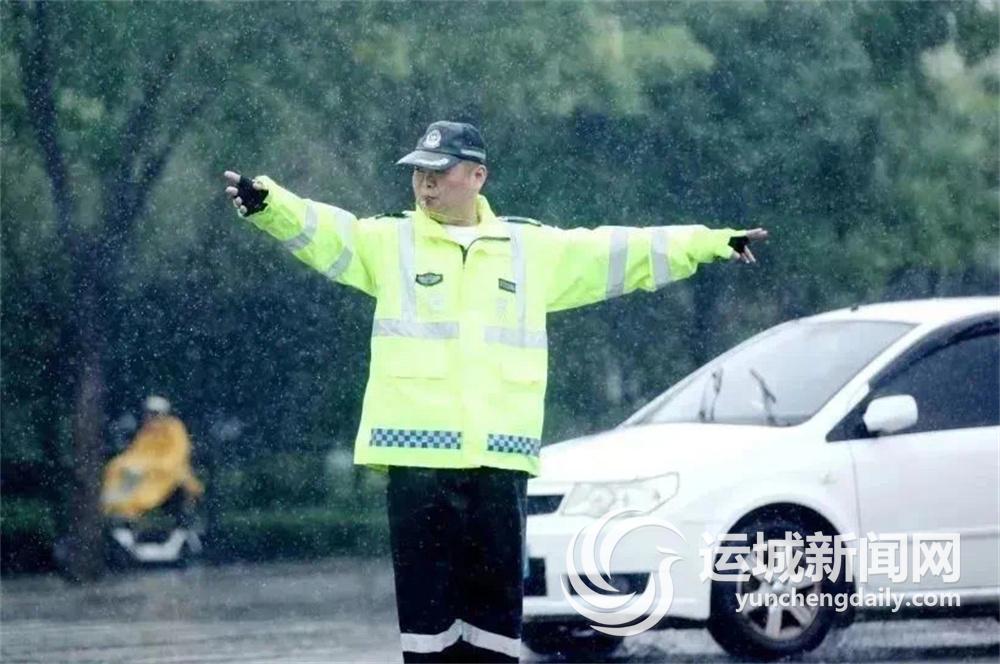 8时许,在市区格林·华林逸墅小区门口,盐湖交警大队八中队民辅警穿着反光雨衣,冒着大雨坚守岗位,通过“红蓝灯”闪烁、“荧光绿”值守等方式,矗立在水中指挥车辆有序通过,同时提醒过往车辆安全驾驶。