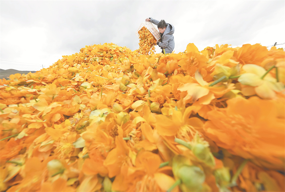 近年来,河北省沽源县依托当地气候特点,引导农民采取“公司+合作社+农户”的模式,发展金莲花种植产业,形成金莲花种植、加工、销售为一体的产业链条,促进农民增收,助力乡村振兴。 新华社记者 杨世尧 摄