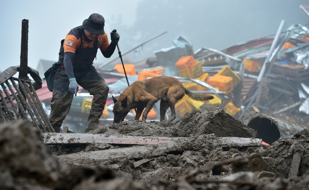 7月16日,在韩国庆尚北道醴泉郡,救援人员在因暴雨引发山体滑坡的村庄内搜救。韩国中央灾难安全对策本部16日通报说,截至当地时间16日11时,连续多日的强降雨已造成全国33人死亡、10人失踪、22人受伤。