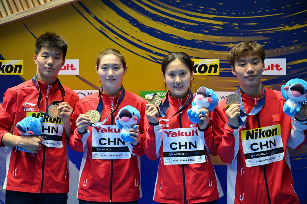 当日,在日本福冈举行的2023年世界游泳锦标赛跳水混合团体决赛中,中国队以489.65分夺冠。