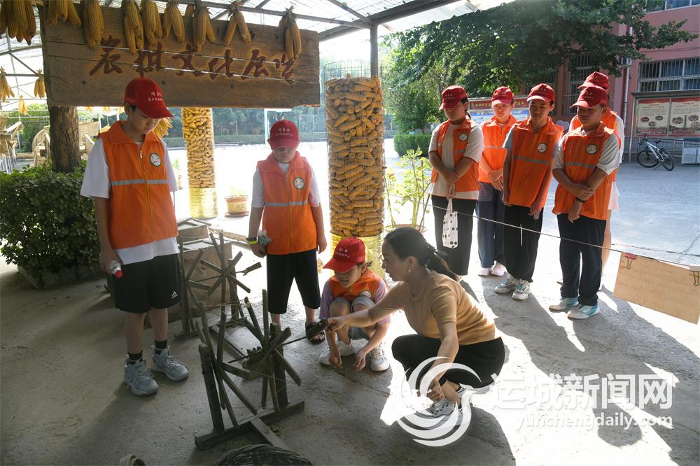 7月18日,参加闻喜县公益夏令营的学生走进闻喜县青少年活动中心农耕文化区,聆听老师讲解农耕文化,参观体验传统农耕工具。