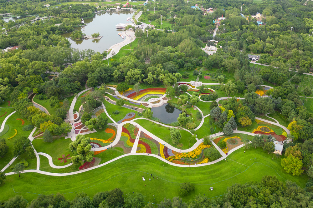 7月21日,人们在哈尔滨太阳岛风景区游玩(无人机照片)。