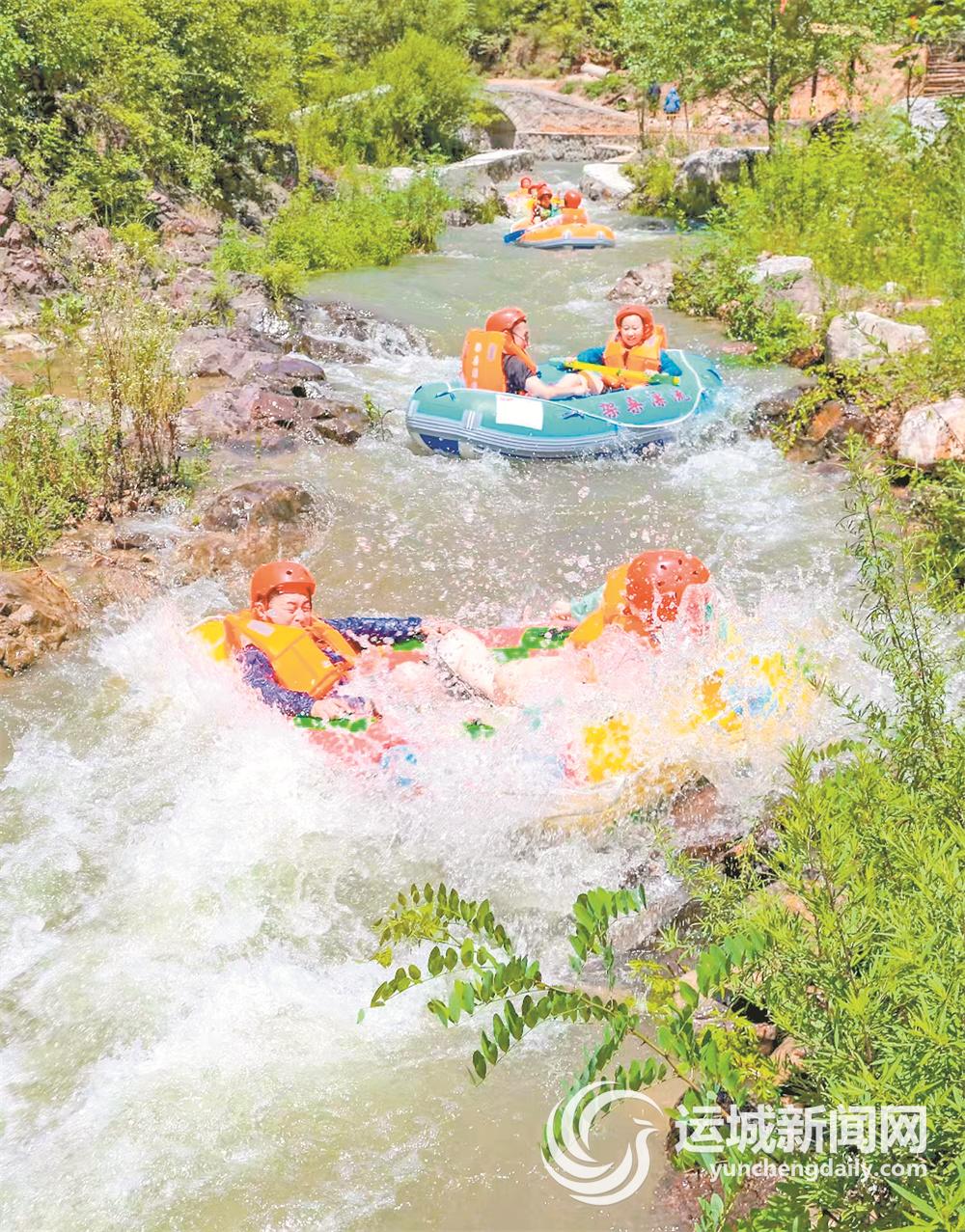7月23日,夏县中条山腹地的泗交镇架桑生态旅游景区,游客在大峡谷里消夏漂流,尽享天然氧吧的魅力。