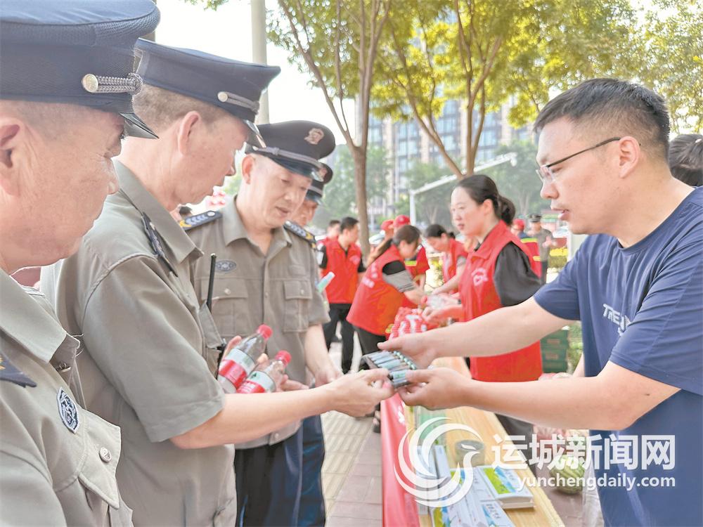 7月25日,盐湖区安邑街道信合名都社区、运城市政务服务中心,在联合开展的“夏日送清凉”活动中,为民辅警、环卫工人、小区保安、快递人员等户外劳动者,送去西瓜、矿泉水、藿香正气水、金银花露等消暑品,让他们在炎炎夏日中感受丝丝“清凉”。记者 崔萌 摄