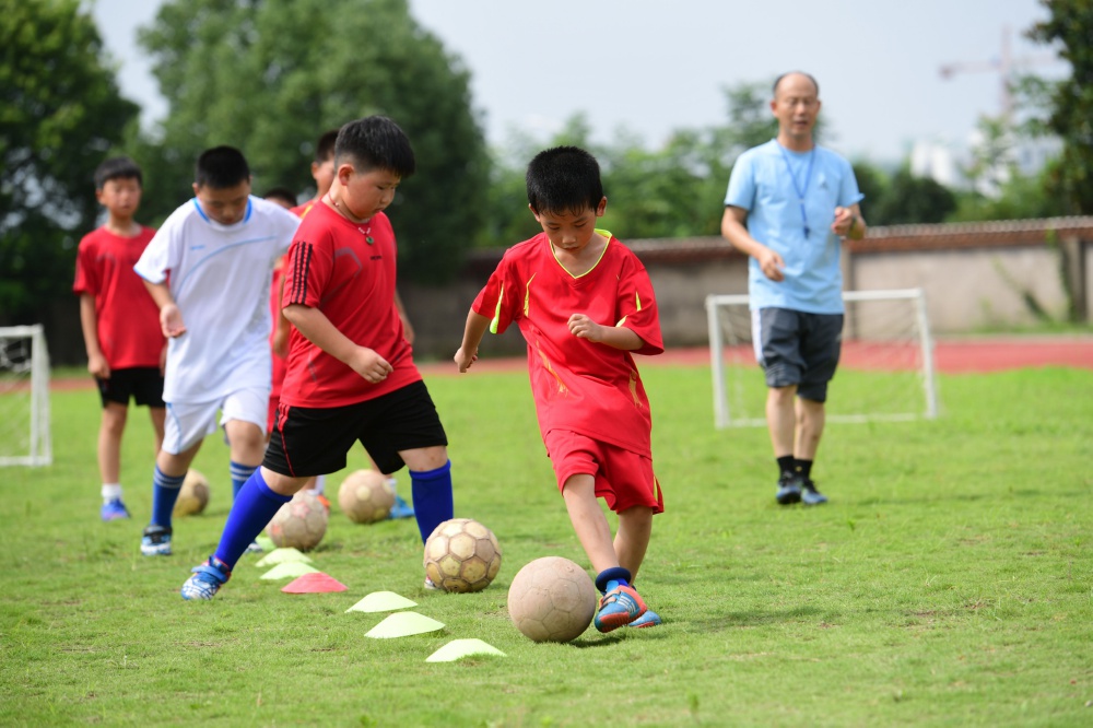 7月25日,孩子们在合肥市肥西县紫蓬镇中心学校少年宫练习足球。