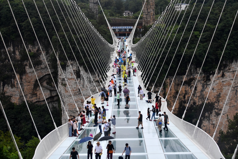 7月25日,游客在张家界大峡谷景区玻璃桥游览。